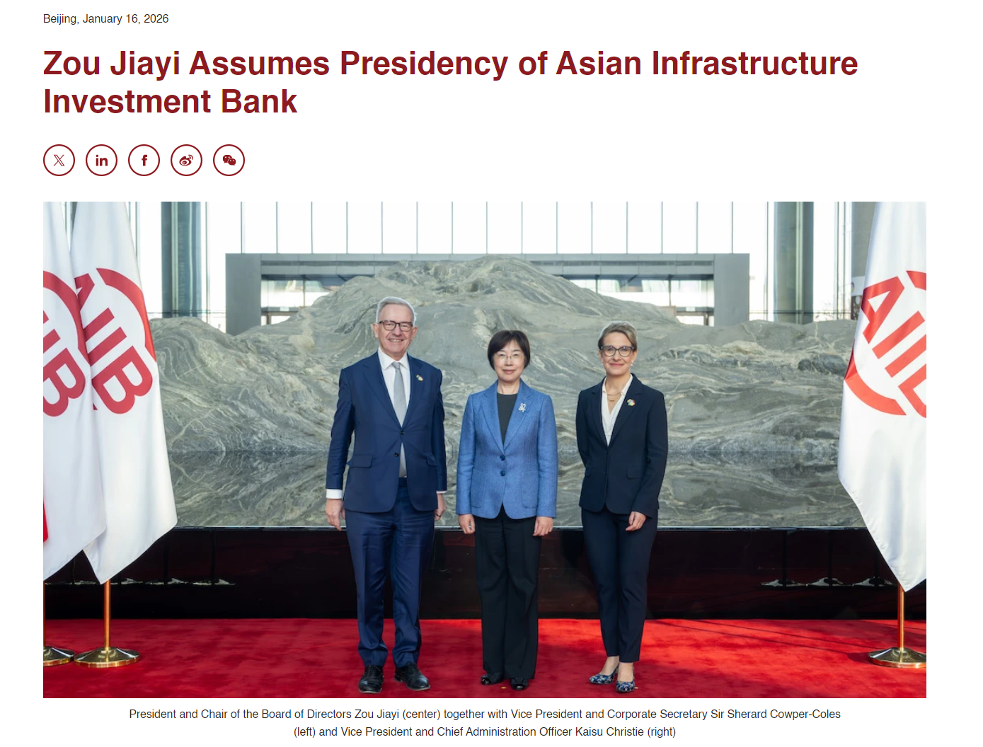 邹对员工表示:“我的信念很简单:一个更美好的世界是可以建设的。不仅仅是想象,而是通过务实合作、有目的的投资和改善人们生活的发展来建设。这一信念将指导我的主席任期。我期待着与我们的会员、客户和合作伙伴合作,建设基础设施,以增强经济、保护气候和自然,并扩大亚洲及其他地区的机会。”