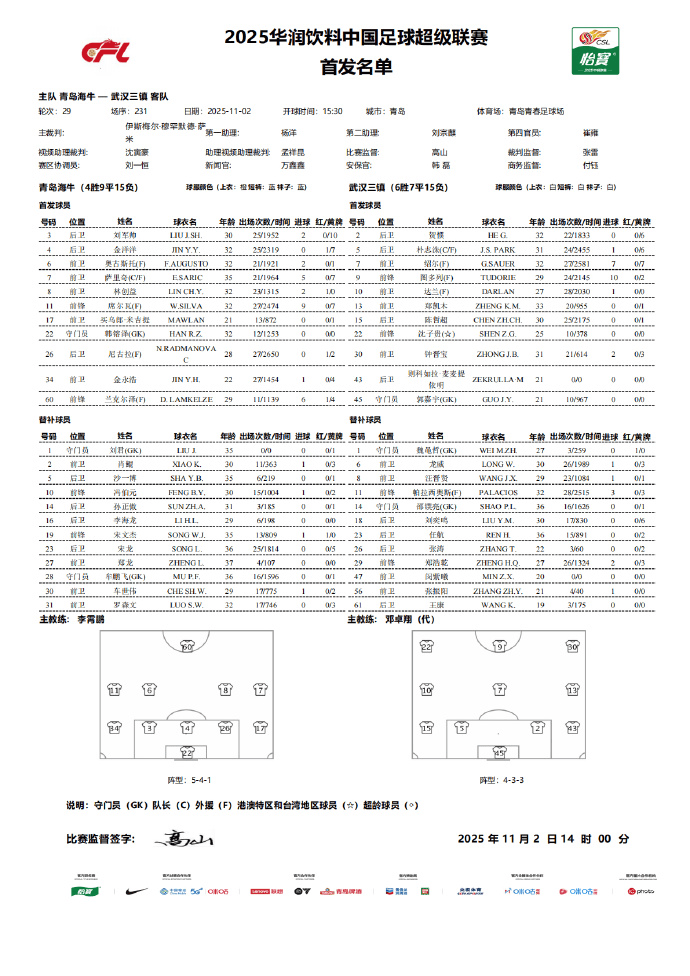 虎扑11月02日讯今天15:30本财配资,中超第29轮,青岛海牛主场对阵武汉三镇,赛前双方公布了首发阵容: