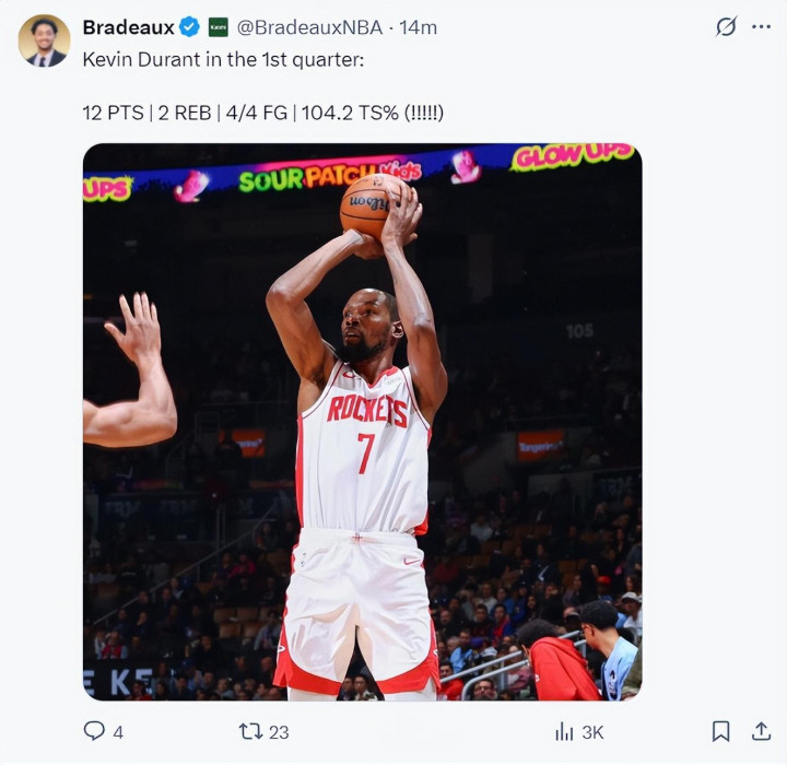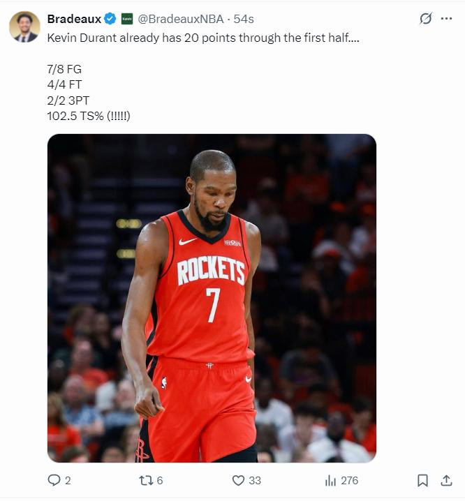 次节杜兰特再度命中两球后才投丢了第一个,火箭也一度领先到19分,好在绿凯突然打出7-0的攻势缩小到12分。乌度卡暂停后再度上了究极五大,杜兰特轻松拿到20分后已经领先到20分,上半场打完杜兰特20分钟,8中7+三分2中2+罚球4中4拿到20分4篮板1盖帽,命中率87.5%。